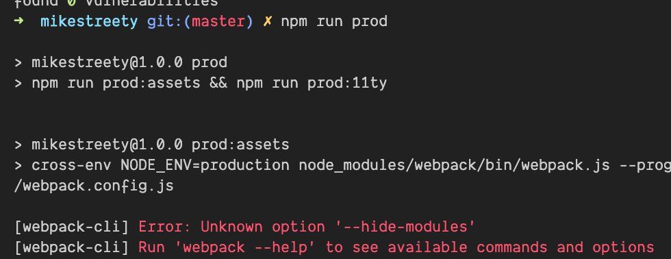 This is what I love and hate about the NPM ecosystem. It's so easy to get a package that does what you want, but it's so fragile. Installed a new (unrelated) module and then ran NPM update. Now my site won't build 😔